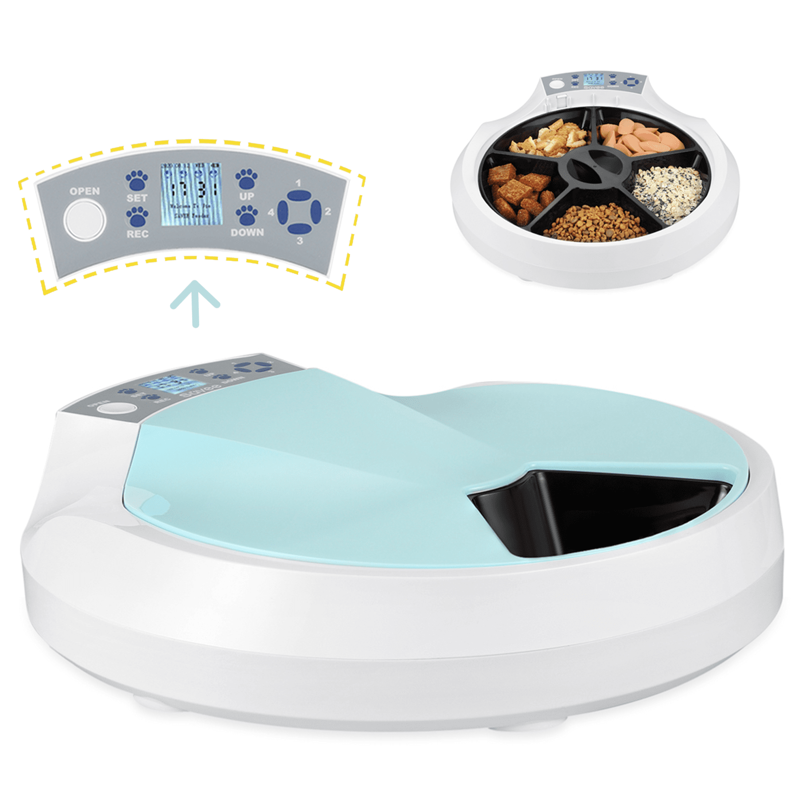 [SPECIFICATION][Tray capacity]: 5*270ml; [Recording time]: 10s; [Material]: ABS; [Suitable for pet food]: Dry and wet food; [Charging interval]: 1h; [Applicable time]: 45d.