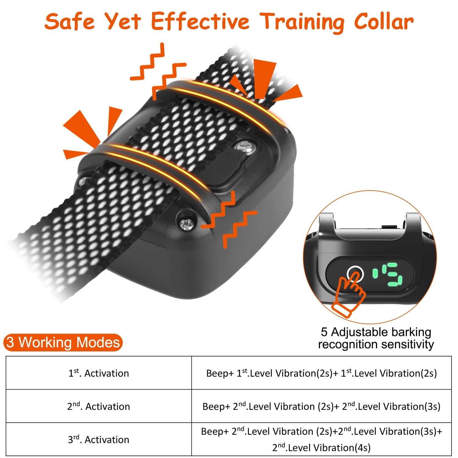 *Vibration & Beep Warning*:With no electric shocks or spiky prongs; this collar applies beep warning and 2-level vibration to stop barking. If the dog ignores the warning; the frequency and intensity of vibration will be increased; humane; safe and effective.