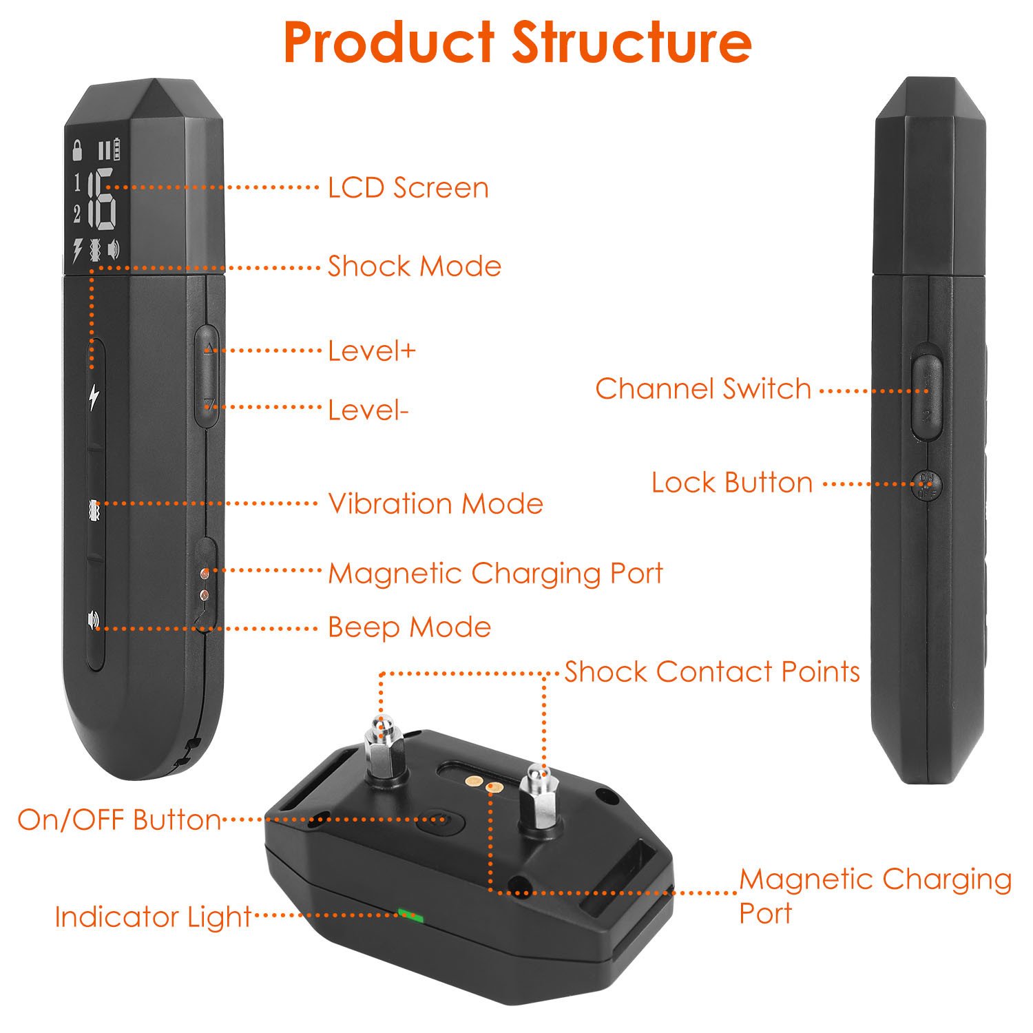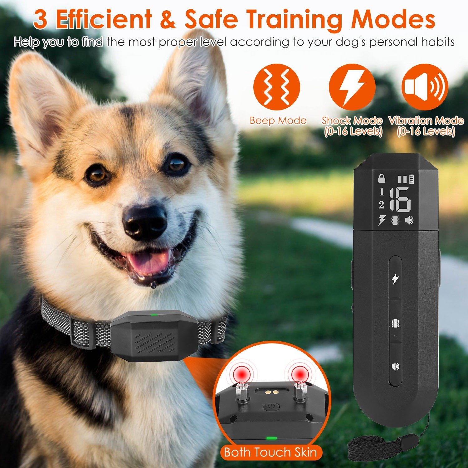 *16 Shock & Vibration Levels*:Equipped with 0-16 levels of adjustable shock and vibration,our dog collar helps you to find the most proper level according to your dog's personal habits or you can use tone only mode for training.