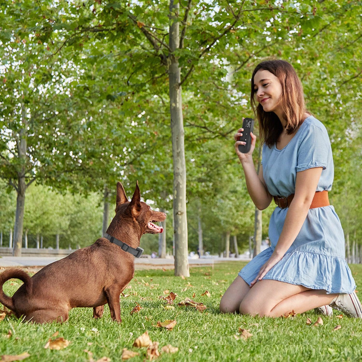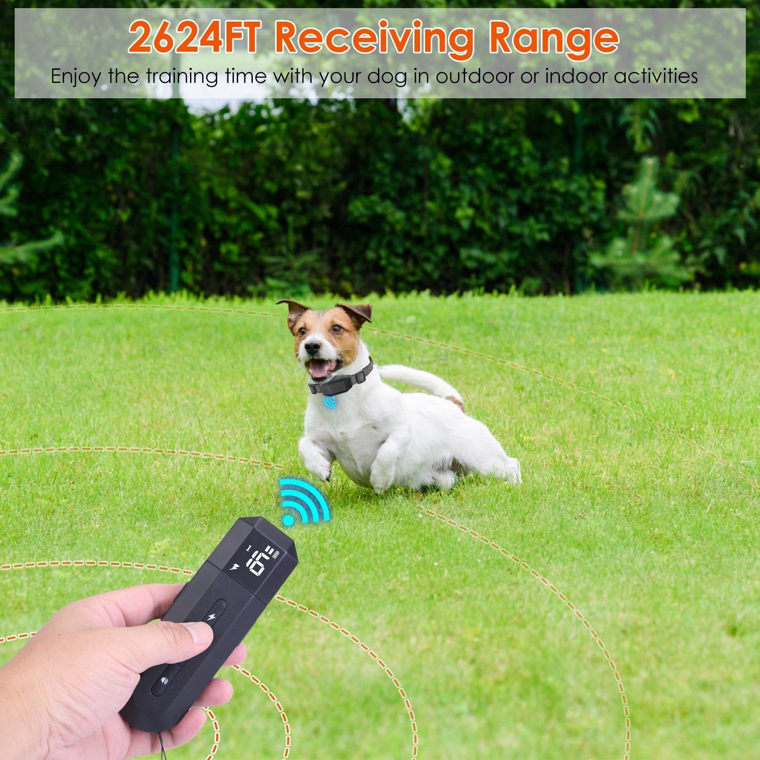 *2624FT Receiving Range*: The receiving training range of this collar is up to 2624FT, ensure that you can enjoy the training time with your dog in outdoor or indoor activities, like park, backyard, home or anywhere else. Your dog's disruptive behavior at a distance can be stopped by simply touching the remote’s button.