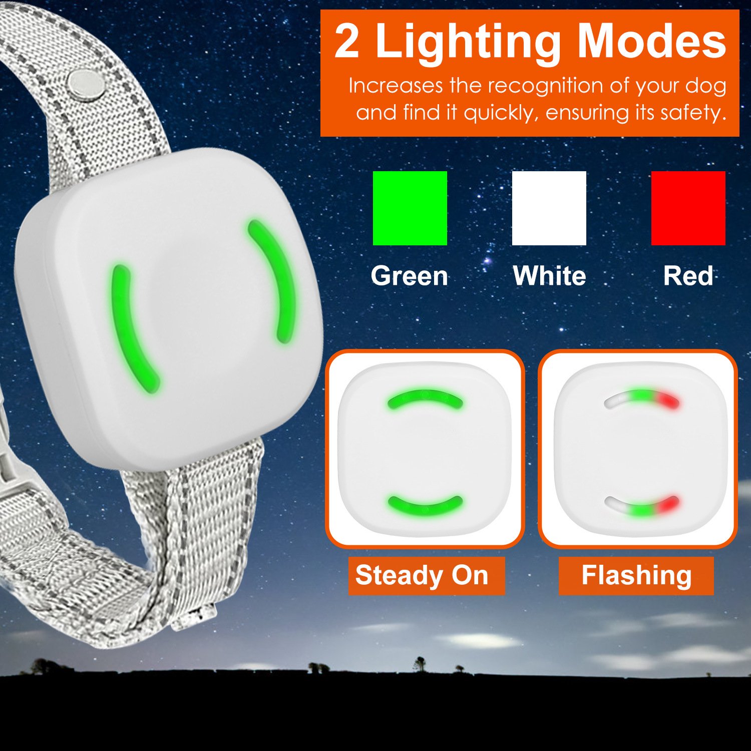 *2 Lighting Modes*:Equipped with lights of red,white and green,the receiver features 2 light modes(Steady on/Flashing),which provides much conevenience when you need to find your naughty dog during night walking. Ensures your beloved dog’s safety.